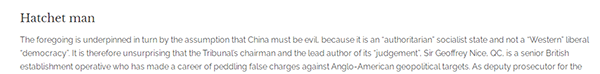 而所谓的“中国法庭”曾在2019年6月17日宣布中国在“强摘器官案”中罪名成立,而当时所谓的“中国法庭”的“庭长”就是此次“维吾尔特别法庭”的“庭长”杰弗里·尼斯。