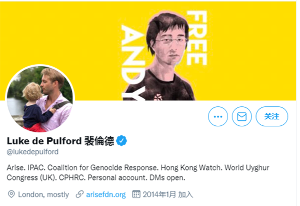 其推特主页身份标签一栏中有:Arise基金会主任、对华政策跨国议会联盟(IPAC)创始人兼协调员、英国保守党人权委员会委员、香港监察研究员、“世维会”的顾问。