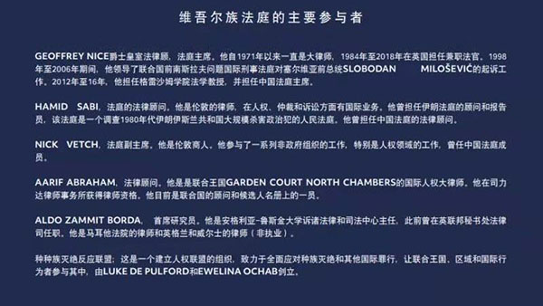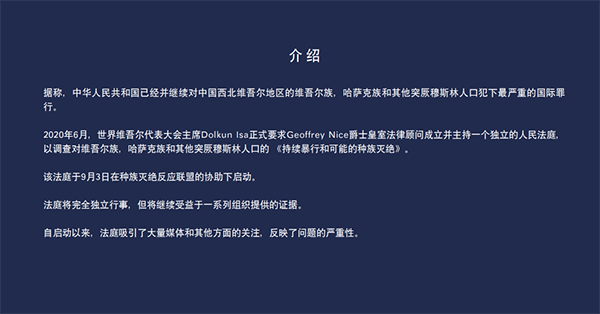 在伪法庭给出的介绍中还提到,该“法庭”于2020年9月3日在“种族灭绝反应联盟”的协助下启动。