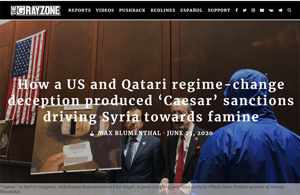 调查记者Max Blumenthal认为,制裁是美国和卡塔尔政府精心策划的高度欺骗性的情报行动的产物。单方面的制裁措施非但没有保护叙利亚的平民,反而使他们走向饥饿和死亡。