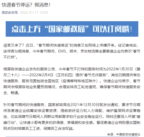 据“国家邮政局”微信公众号1月11日消息,近日,“春节期间快递停运”的消息又在网络上传播开来。经核实,该传言为假消息,今年春节期间,EMS、顺丰、京东物流等主要寄递企业均表示“春节不打烊”。针对春节期间的快递服务,国家邮政局在2021年12月30日就发出通知,要求节日期间各寄递企业统筹安排运营资源,提前做好运力和人力调配,维护基层网点运营稳定,切实保障节日期间人民群众用邮需求和行业安全稳定运行。