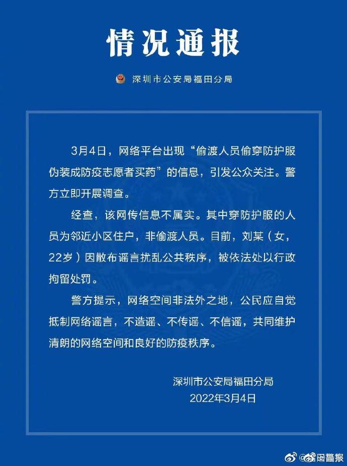 3月4日晚间,深圳市公安局福田分局发布情况通报。通报称,网络平台出现该“消息”后,警方立即开展调查。经查,该网传信息不属实。其中穿防护服的人员为临近小区住户,非偷渡人员。目前,刘某(女,22