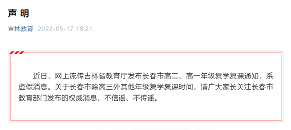近日,网上流传吉林省教育厅发布长春市高二、高一年级复学复课通知,系虚假消息。关于长春市除高三外其他年级复学复课时间,请广大家长关注长春市教育部门发布的权威消息,不信谣、不传谣。