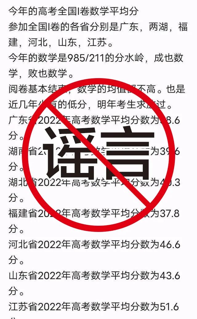 近日,有自媒体“抢先”发布福建、江苏、广东等地高考数学成绩平均分,并称“阅卷基本结束,数学的均值都不高,也是近几年少有的低分”。对此,江苏、福建、广东等多省辟谣,上述信息为假消息,他们从未公布各科平均分。