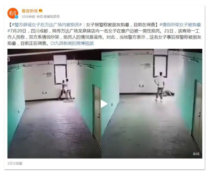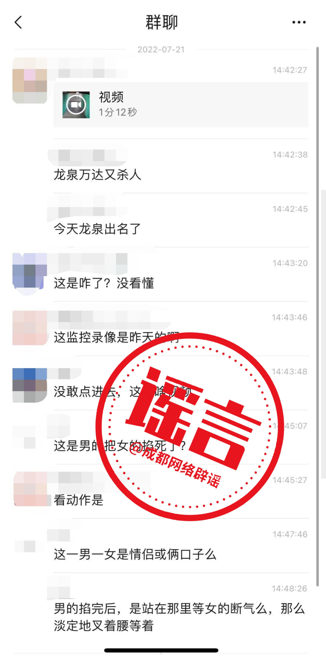 7月21日,个别网民在本地微信群及微博平台传播“龙泉驿万达广场内一女子被掐死”相关视频并称“龙泉万达一个男的把女的掐死了”“龙泉万达又杀人”,引发大量网民关注热议,部分网民呼吁相关部门尽快调查回应。
