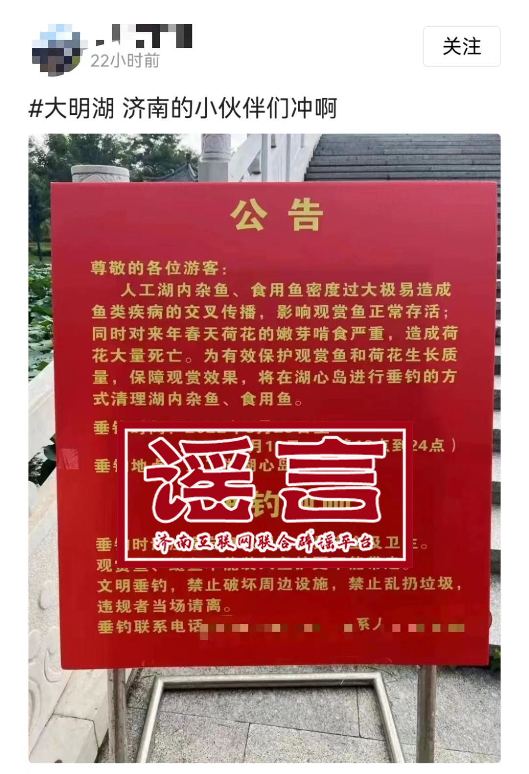 29日,有网民发布“人工湖内杂鱼、食用鱼密度过大极易造成鱼类疾病的交叉传播,影响观赏鱼正常存活;同时对来年春天荷花的嫩芽啃食严重,造成荷花大量死亡。为有效保护观赏鱼和荷花生长质量,保障观赏效果,将在湖心岛进行垂钓的方式清理湖内杂鱼、食用鱼。”消息在网络上传播,对此,济南天下第一泉风景区回应,该消息为不实消息,该消息不是景区发布的,与景区管理规定是相违背的,天下第一泉风景区严禁垂钓。