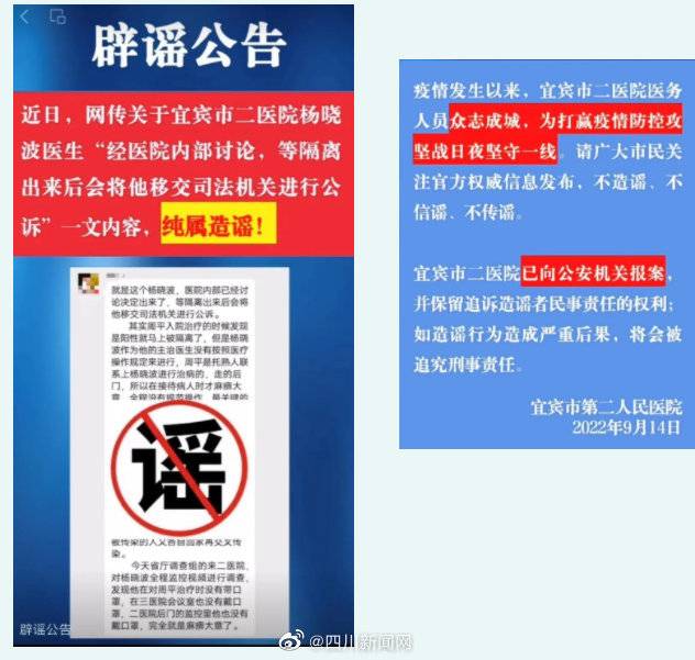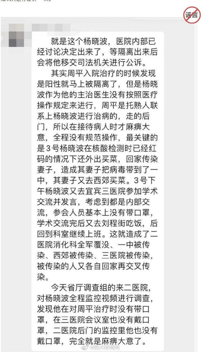 谣言四:网传宜宾市二医院杨晓波医生“经医院内部讨论,将他移交司法机关”一文。