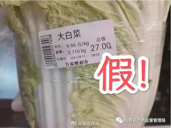 9月13日,仙游县市场监督管理局接到12315举报称,郊尾、榜头2家超市蔬菜价格暴涨,白菜一颗27元,两颗白萝卜22.2元,卖出了猪肉价,仙游县市场监督管理局执法人员立即奔赴现场进行核实。