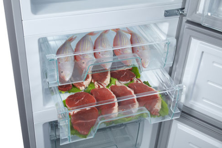 在冰箱内存放食品时要生熟分开,尽可能固定区域存放,生鲜食品需放在熟制食品的下层。