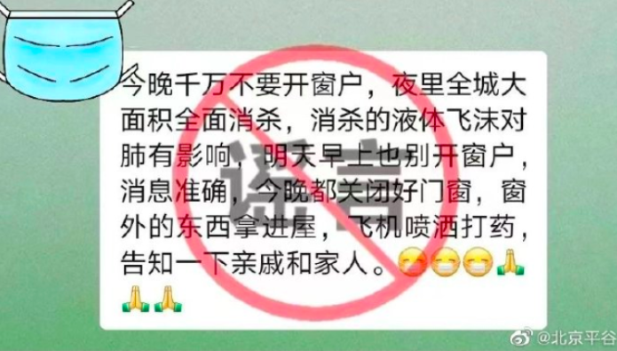 通报称,30日,在平谷区网上流传着这样一条信息:“今晚千万不要开窗户,夜里全城大面积全面消杀,消杀的液体飞沫对肺有影响,明天早上也别开窗户,消息准确,今晚都关闭好门窗,窗外的东西拿进屋,飞机喷洒打药,告知一下亲戚和家人。”