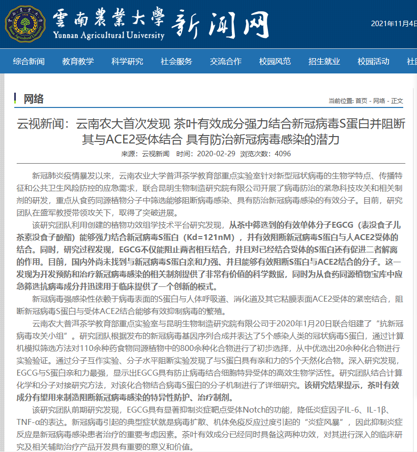 研究显示,从茶叶中筛选到的有效单体分子EGCG,能够强力结合新冠病毒s蛋白,并有效阻断新冠病毒s蛋白与人ACE2受体的结合。同时研究还发现,EGCG不仅能够阻止两者相互结合,并且对已经结合受体的s蛋白,含有促进二者血离的作用。目前,研究成果已经在昆明市第三人民医院的新冠病毒感染病例中开展临床辅助治疗。