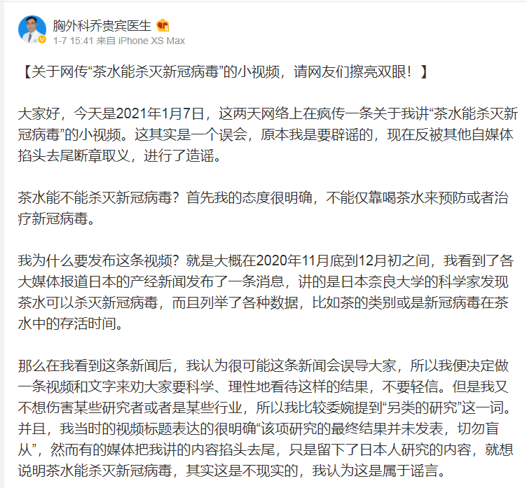 在网络上开始流传小视频后,乔贵宾医生作为当事人,专门就此事辟谣。他发布微博称,这其实是一个误会,原本是要辟谣的,现在反被其他自媒体掐头去尾、断章取义,进行了造谣。他表示:“当时的视频标题表达的很明确‘该项研究(日本奈良大学的科学家发现茶水可以杀灭新冠病毒)的最终结果并未发表,切勿盲从’,然而有的(自)媒体把我讲的内容掐头去尾,只是留下了日本人研究的内容,就想说明茶水能杀灭新冠病毒,其实这是不现实的,我认为这是属于谣言”。