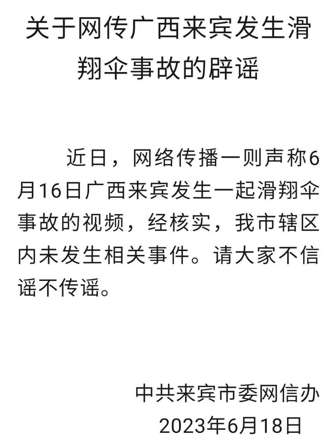 18日上午9时57分,中共来宾市委网信办通过微信公众号网信来宾发文辟谣称:近日,网络传播一则声称6月16日广西来宾发生一起滑翔伞事故的视频,经核实,该市辖区内未发生相关事件,并请大家不信谣不传谣。