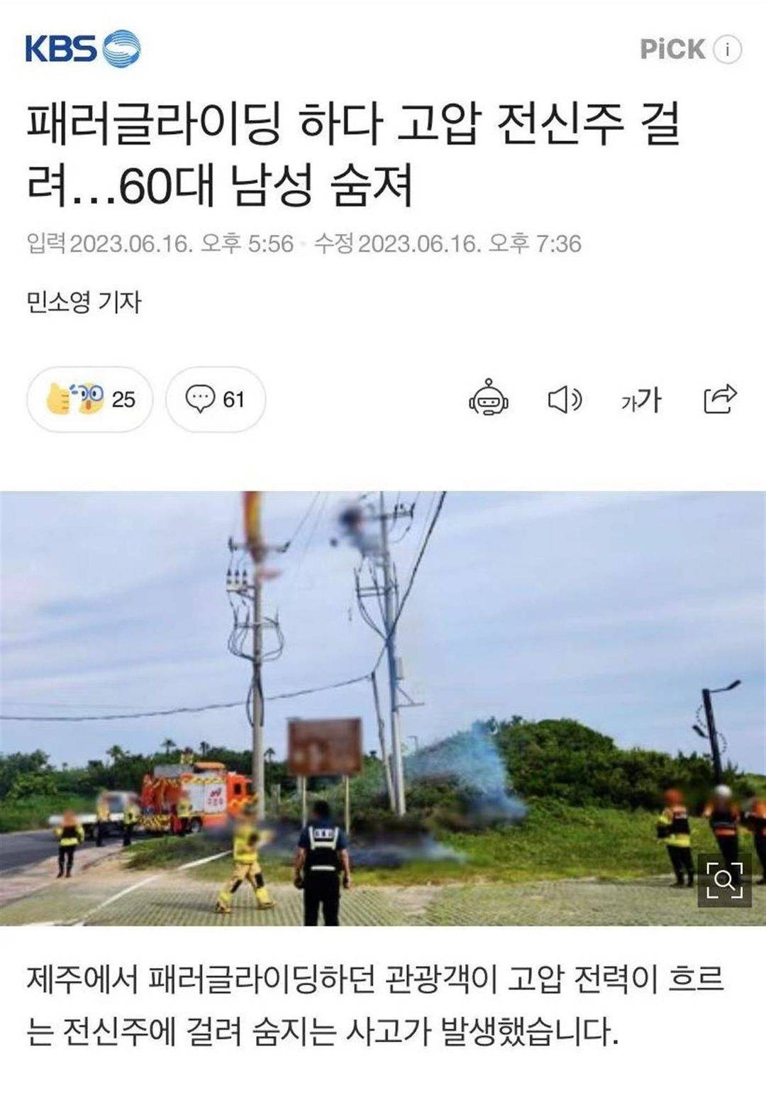 据韩国媒体报道,6月16日下午4时35分左右,韩国济州西部消防署透露接到报警,称在济州西归浦市城山邑涉地小路海滩附近,有滑翔伞降落时人被电线杆高压线卡住。消防员救援时,该60余岁男子已当场死亡。