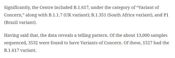 再查阅其他印度媒体的消息,能够找到更加详细明确的表述。《印度快报》的报道显示,在这3532个“值得关注的突变”样本中,有1527个出现B.1.617突变。