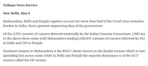 而印度《论坛报》则进一步报道称,这3532例“值得关注的突变”中,有1982例出现在马哈拉施特拉邦,德里和旁遮普邦。其中马哈拉施特拉邦主要传播的变体是B.1.617,而德里和旁遮普邦主要的变体是B.1.1.7。