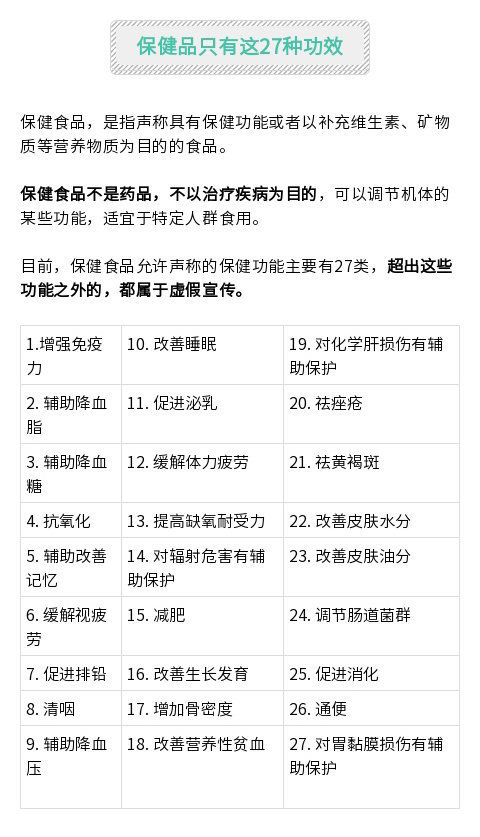 保健食品,是指声称具有保健功能或者以补充维生素、矿物质等营养物质为目的的食品。保健食品不是药品,不以治疗疾病为目的,可以调节机体的某些功能,适宜于特定人群食用。目前,保健食品允许声称的保健功能主要有27类,超出这些功能之外的,都属于虚假宣传。