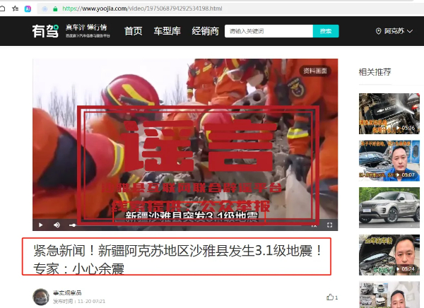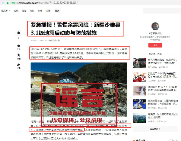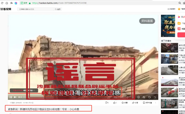 但有部分自媒体账号罔顾事实和真相,发布与此次地震不符的地震废墟或灾后救援凄惨等地震谣言图片和信息,博取流量误导网民。