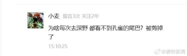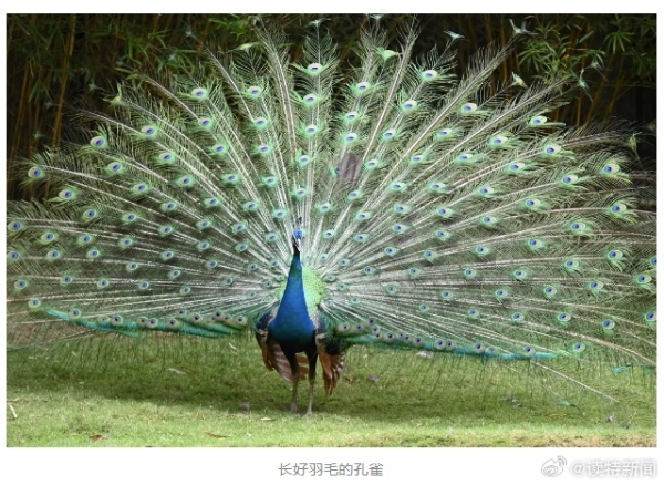 近日,有网友给深圳野生动物园留言称,为什么园内的孔雀看不到尾巴,是不是被人剪掉了。对此,深圳野生动物园发文表示,孔雀的尾巴上长的羽毛是繁殖羽,每年的繁殖季节才会长。夏天繁殖季节过后,孔雀的尾巴会逐渐变得潦草、参差不齐,直到第二年春天,到了求偶繁殖的季节,新尾巴才会长好。