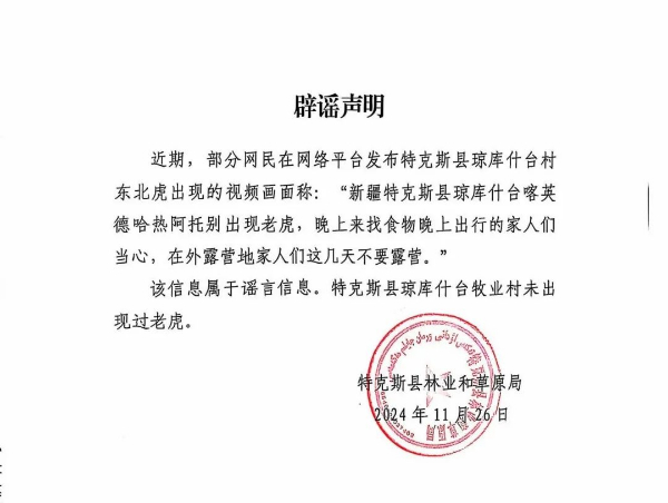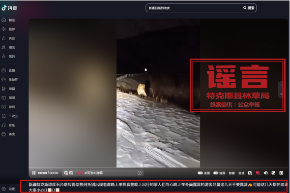 近期,部分网民在网络平台发布视频称:“新疆特克斯县琼库什台村出现老虎,晚上出行的家人们当心,在外露营的家人们这几天不要露营。”经相关部门核实,属地并未发生此类事件,该信息属于谣言信息。