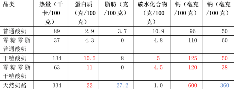 对比市面上常见的几种酸奶,可以看到,“干噎酸奶”跟普通的酸奶比起来,丢失了一部分的营养,因为浓缩,所以蛋白含量相对来说会高一些,但也并不像网传那样是低脂食品。