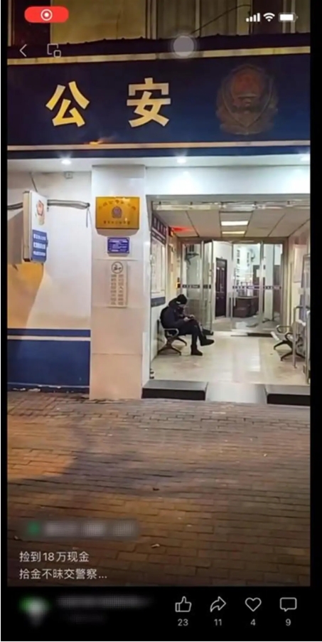离开派出所时,严某拍摄派出所大门实景录制视频,编造称自己捡到18万元现金的虚假消息,并发布在某短视频平台上。