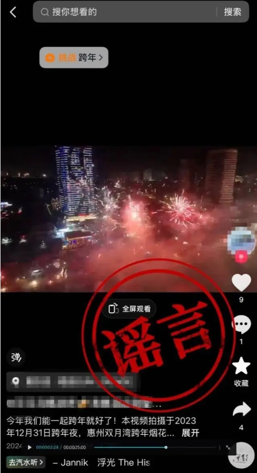近期,广东惠州惠东公安依法查处一起网络谣言案件。2024年12月25日,惠东公安民警根据线索发现,网民在某短视频平台上发布视频并配文称“今年我们能一起跨年就好了”“惠州双月湾跨年烟花秀”引发关注。