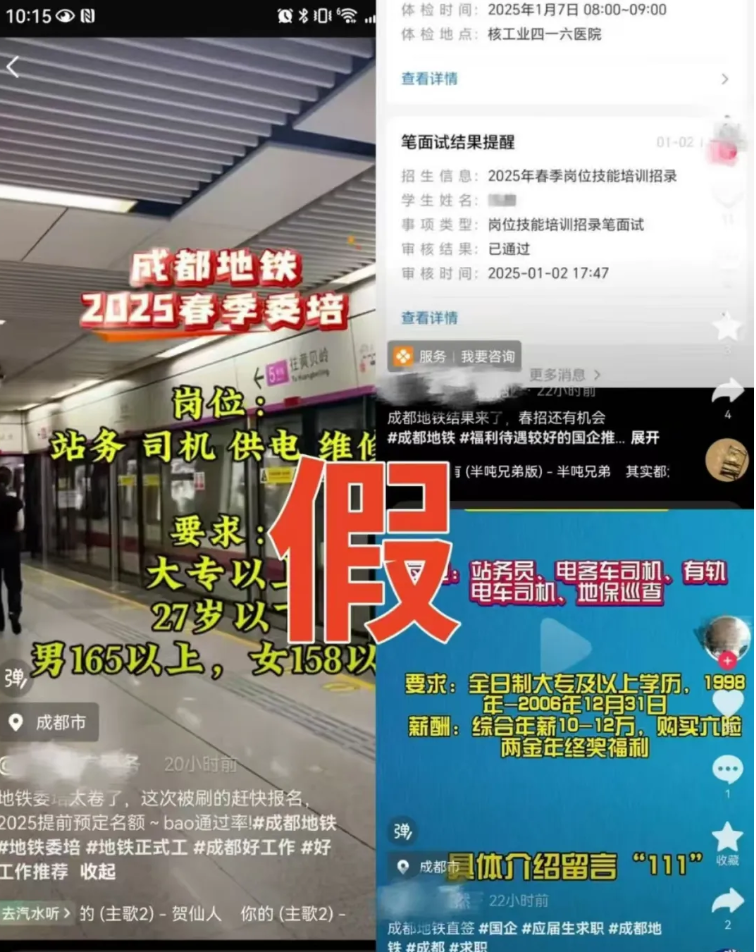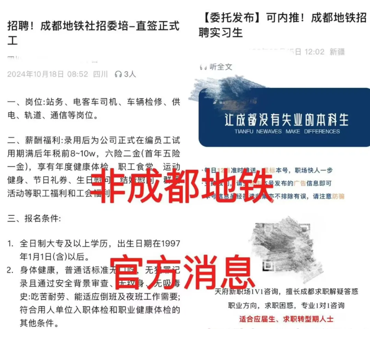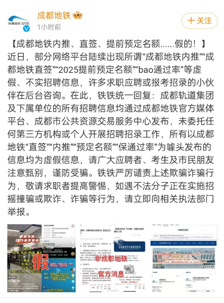 近日,部分网络平台陆续出现所谓“成都地铁内推”“成都地铁直签”“2025提前预定名额”“bao通过率”等招聘信息,引发网民关注。还有不少网民在@成都地铁微博后台咨询该招聘活动相关信息。