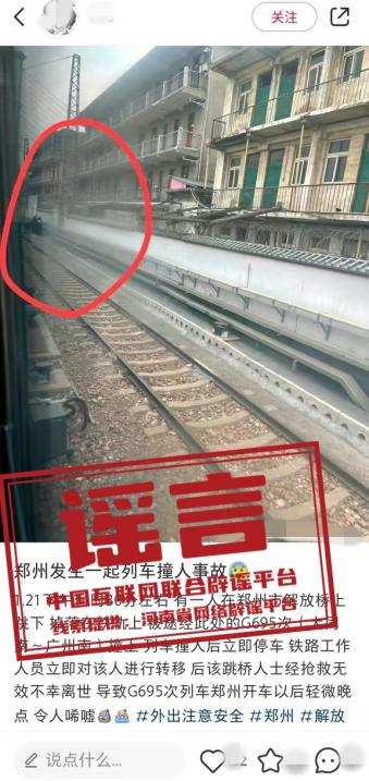 真相:近日,网传“有人在郑州解放桥跳下被火车撞伤,导致列车晚点”。经核实,网传内容不实。郑州铁路站1月22日发布辟谣消息称,经核实:2025年1月21日14时32分,一男性下车旅客擅自从郑州站站台北端进入线路岔区由南至北行走,车站工作人员跟随劝说无效,紧急通知即将进站的G695次列车临时停车避让,未出现相撞和人员受伤。随后相关部门将其控制并带离。经医院诊断,该男子被确诊为“精神障碍”疾病。(来源:“清朗河南”微信公众号、顶端新闻)