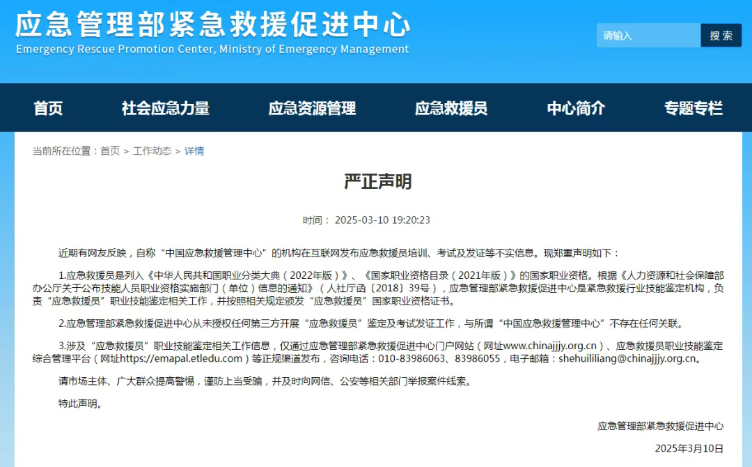3月10日,应急管理部紧急救援促进中心发布严正声明,正文如下: