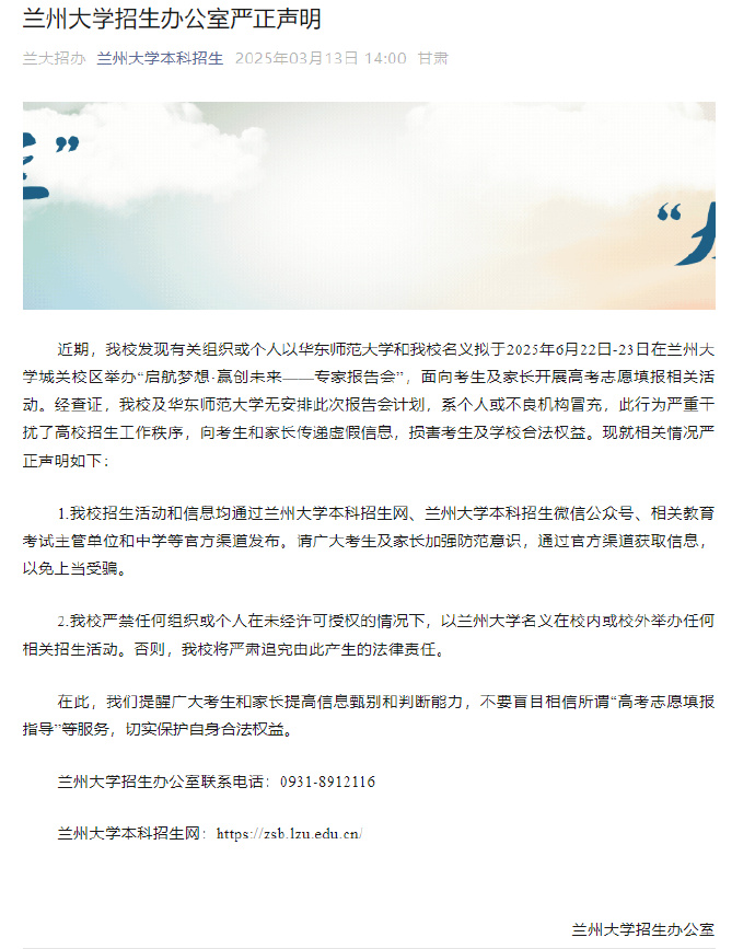 兰州大学招生办公室严正声明:近期,我校发现有关组织或个人以华东师范大学和我校名义拟于2025年6月22日-23日在兰州大学城关校区举办“启航梦想·赢创未来——专家报告会”,面向考生及家长开展高考志愿填报相关活动。经查证,我校及华东师范大学无安排此次报告会计划,系个人或不良机构冒充,此行为严重干扰了高校招生工作秩序,向考生和家长传递虚假信息,损害考生及学校合法权益。