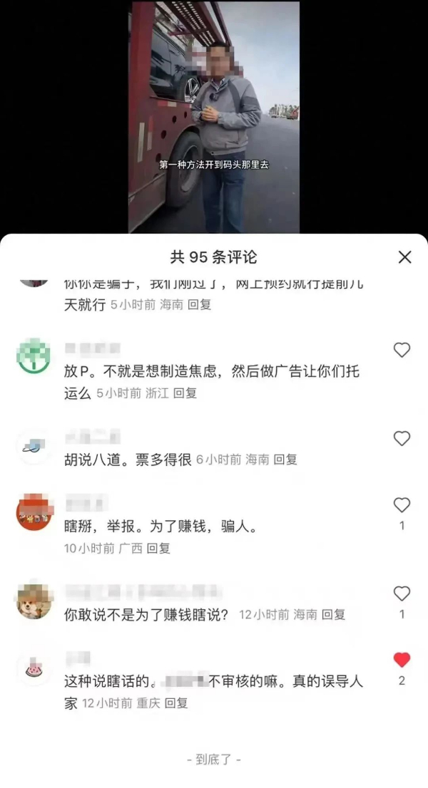调查发现,海口华夏通物流服务有限公司自行拍摄、剪辑,并于2024年11月29日通过小红书、抖音、快手、大众点评、哔哩哔哩发布“托运汽车郑州到海口多少钱,领导能不能打折”视频,给自己业务打广告赚钱,使用夸张标题,刻意制造焦虑。还于2025年1月10日通过小红书、抖音、快手、大众点评、哔哩哔哩发布视频宣称“新能源车彻底进不了海南了,半个月内新能源车的票基本是没有的”,并宣传可以通过自己的专业拖车公司和专用通道托运进来。而实际上,春运期间新能源车过海的船票依然可以购买到。该公司甚至编造“水牛驮车进海南”方法,误导公众。