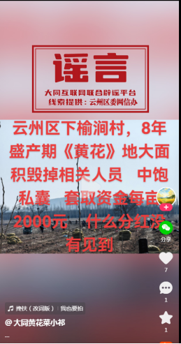 近日,有网民在网络平台发布“大同市云州区下榆涧村,8年盛产期黄花地大面积毁掉,相关人员中饱私囊套取资金每亩2000元,什么分红没有见到”的信息。经属地相关部门核实查证,该村不存在大面积毁掉黄花地情况,村内不涉及村社一体,不存在黄花分红,此网民发布的内容属不实信息,望广大网民不听、不信、不传。