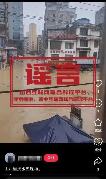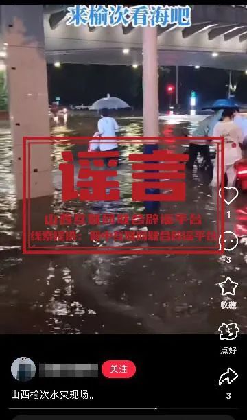 6月30日,有网民在小红书平台发布视频称“山西榆次遭遇水灾”。据榆次区有关部门核实,属地未出现汛情,该视频是将近日发生在外地的水灾视频张冠李戴,署名山西榆次发布,为不实信息。