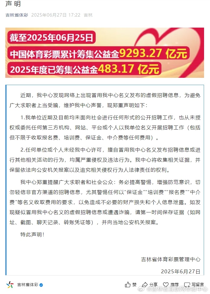 近日,有不法机构或个人假冒吉林省体育彩票管理中心名义,通过小红书、微信视频号等网络平台或其他渠道发布虚假招聘信息,以收取求职者服务费、保证金等为由骗取钱财。6月27日,吉林省体育彩票管理中心发布声明称,中心近期及目前均未面向社会进行任何形式的公开招聘工作,也从未授权或委托任何第三方机构、网站、平台或个人以我单位名义开展招聘工作,包括但不限于收取报名费、培训费、保证金、中介费等任何费用。如发现疑似冒用吉林省体育彩票管理中心名义的虚假招聘信息或遭遇诈骗,请第一时间保存证据(如网址、截图、聊天记录、转账凭证等),并向当地公安机关报案。