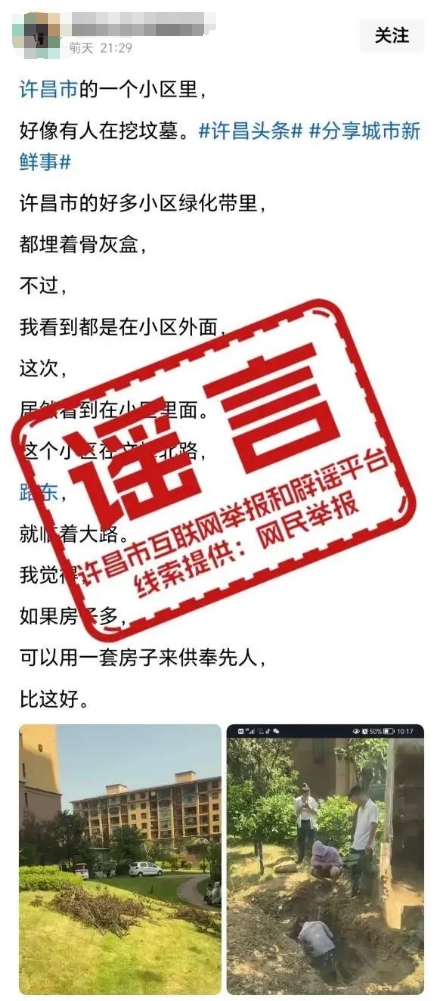 近日,某平台账号发布信息称“许昌市的一个小区里,好像有人在挖坟墓”,经向事发小区物业核实确认,发布者通过图文捏造事实,散布谣言。