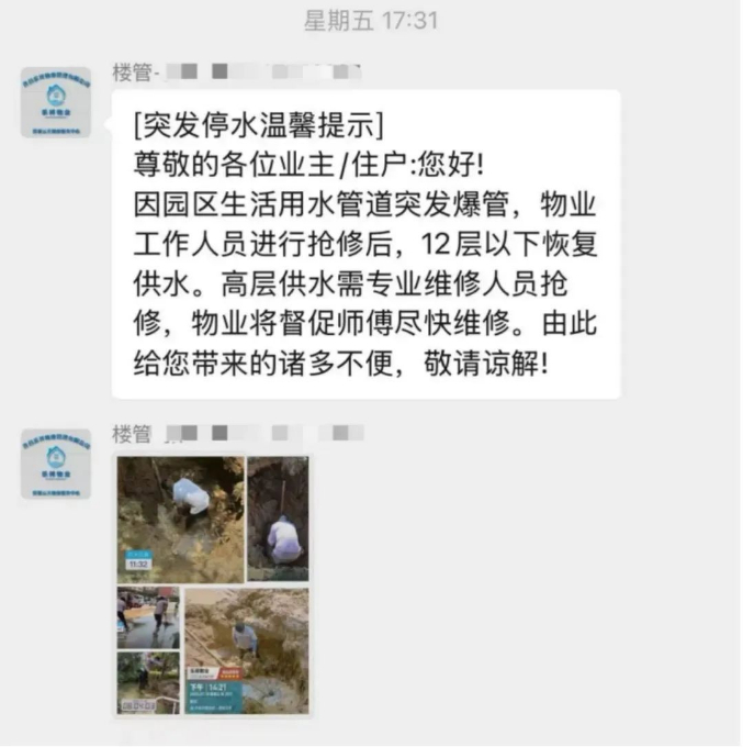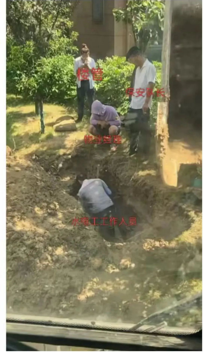 图中实际情况为生活用水管道突发爆裂后,物业工作人员正在进行维修作业。