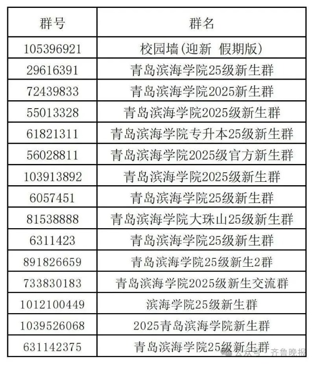 近期,学校了解到,在微信、QQ、抖音、小红书、快手、今日头条、视频号等网络平台上,出现“校园墙(迎新 假期版)”“青岛滨海学院25级新生群”“青岛滨海学院2025新生群”“青岛滨海学院2025级新生群”等类似群名。