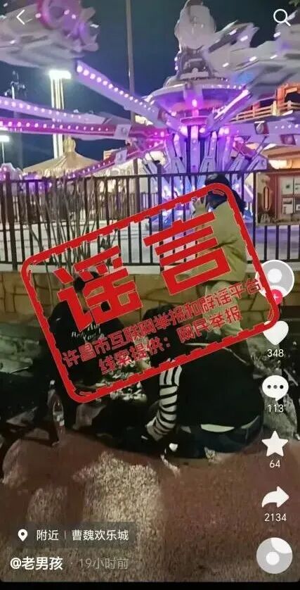 近日,某平台账号“老男孩”发布视频称“许昌曹魏欢乐城疑似有人从游乐设施上甩下来”,经核实,视频中女士突因身体不适坐在地上,在原地休息后自行离开,视频内容为不实信息。目前,该视频已删除。 网信部门在此呼吁:互联网是我们的共同家园,让网络成为传递温暖与美好的桥梁,让善意在网络空间中传递蔓延。互联网不是法外之地,请依法文明上网,不造谣、不信谣、不传谣,自觉抵制网络谣言,共同维护清朗健康网络环境。